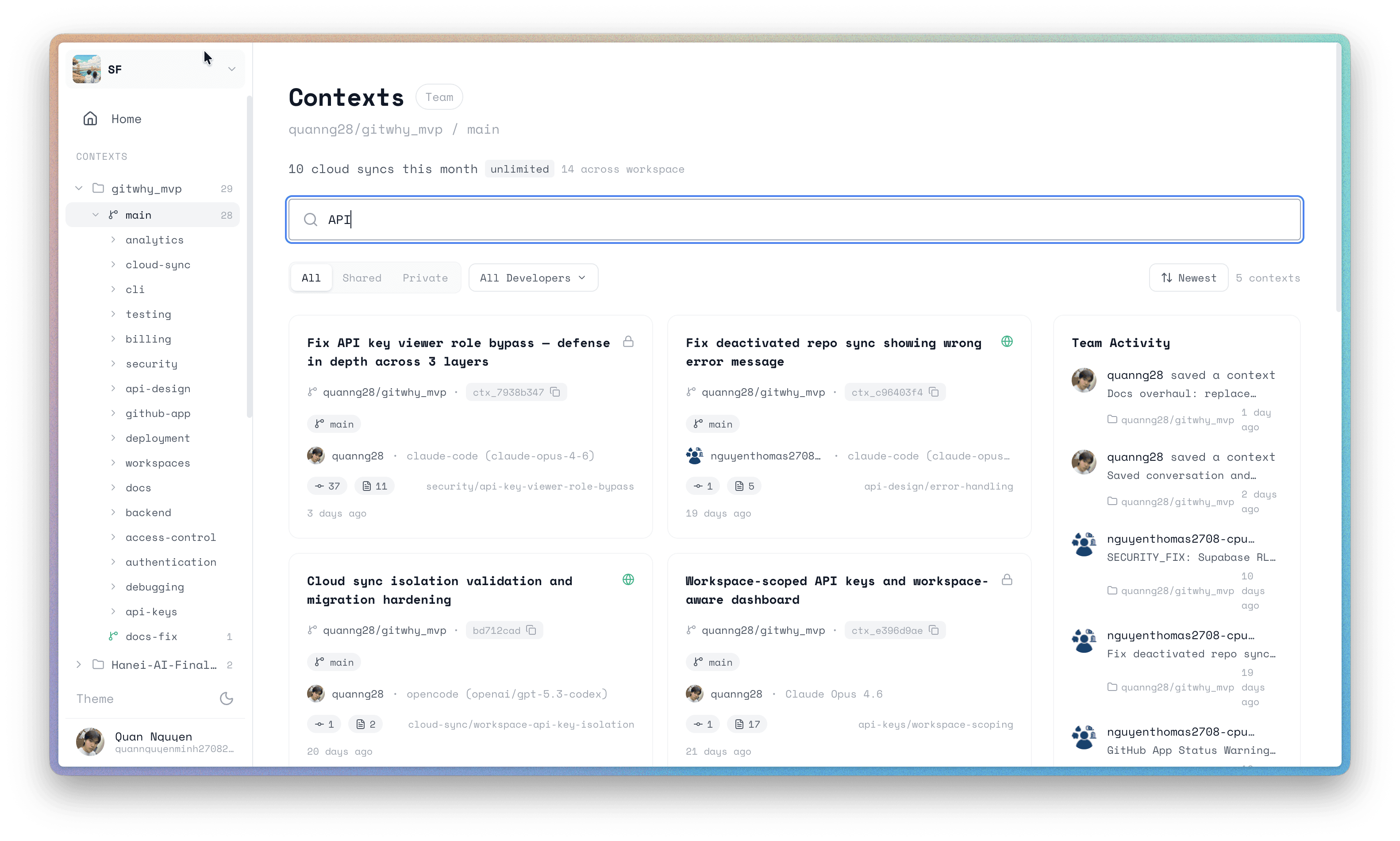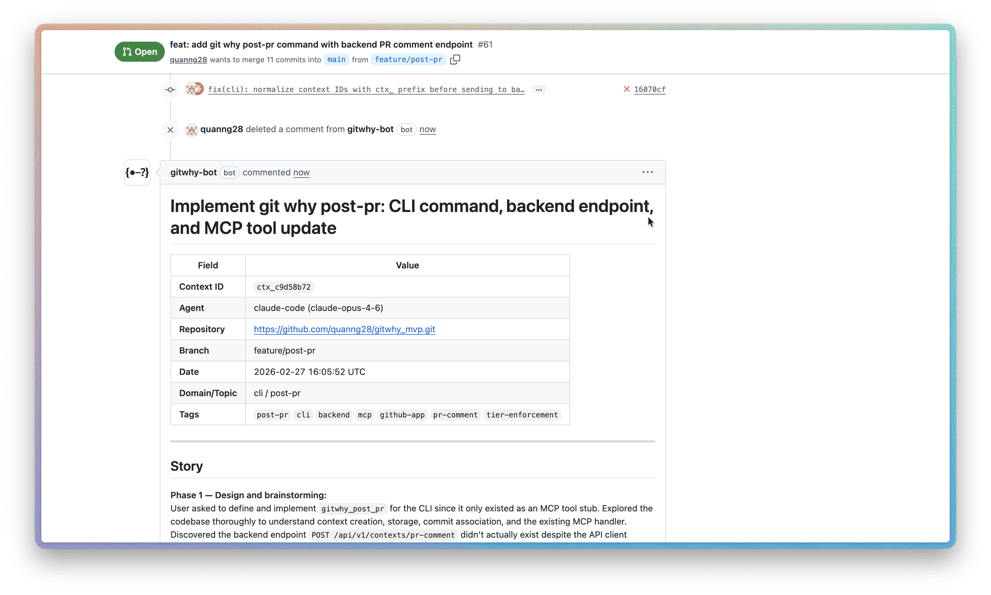 Share contexts across your org. gitwhy-bot posts full reasoning to PRs for reviewiers