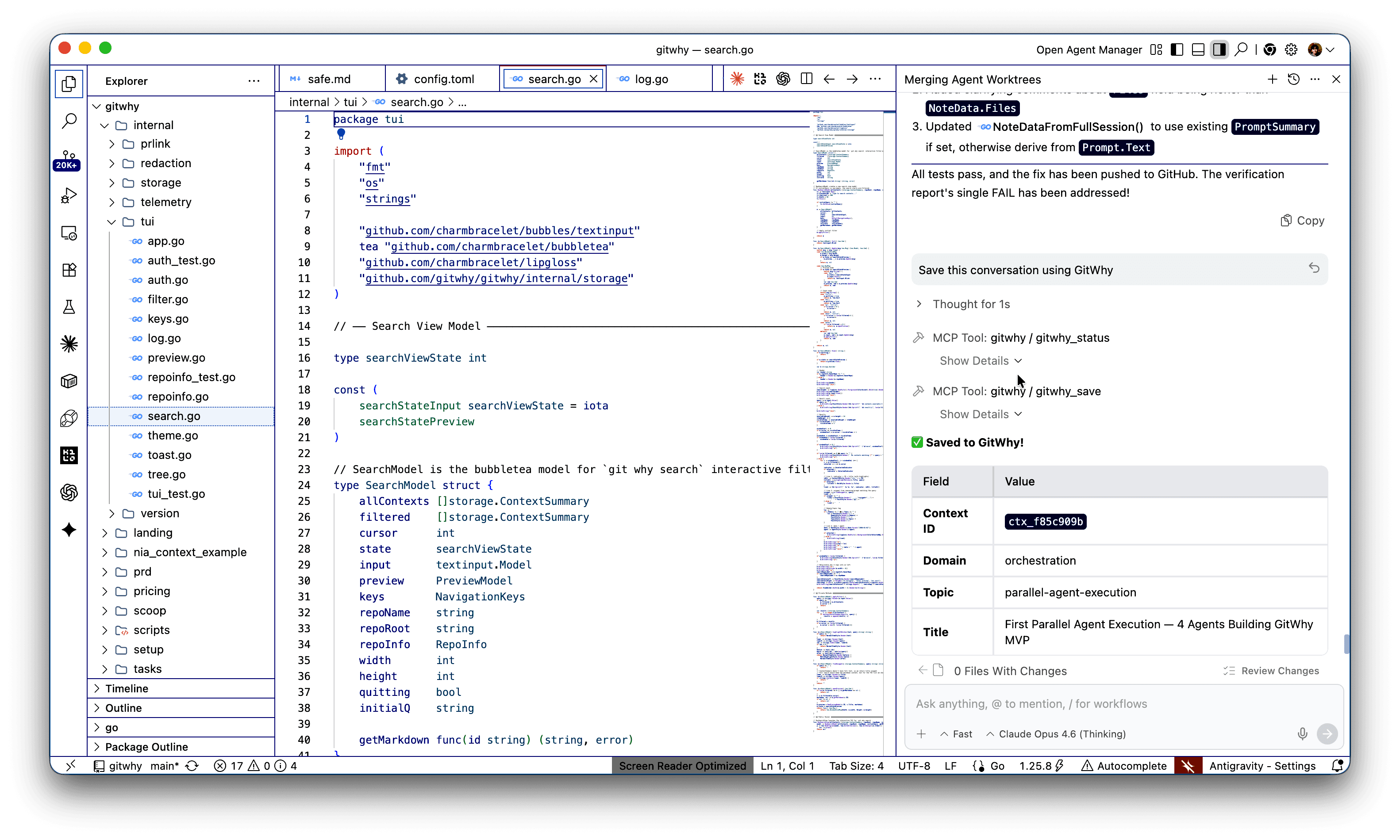 Fixed template: prompt, reasoning, decisions, rejected alternatives, files, and commits. Consistent across every agent.